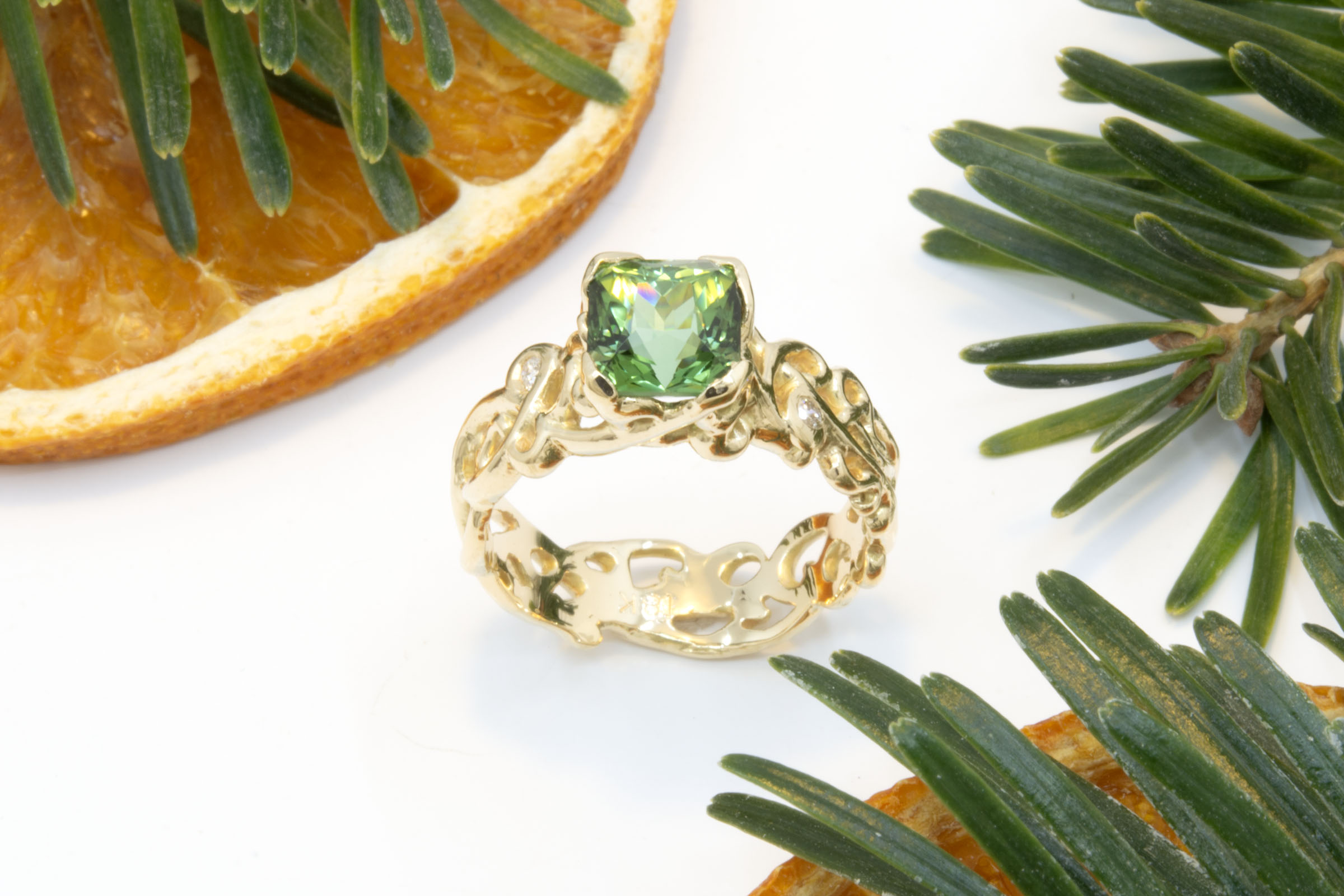 This 18k gold ring features a 1.26 carat green tourmaline in an open filigree design with 0.03 carats total weight diamonds. Designed and handcrafted by Hunt Country Jewelers. This ring is a size 6 and can be resized within 2 sizes on request, for other sizes contact us about making a customized version that fits your needs.