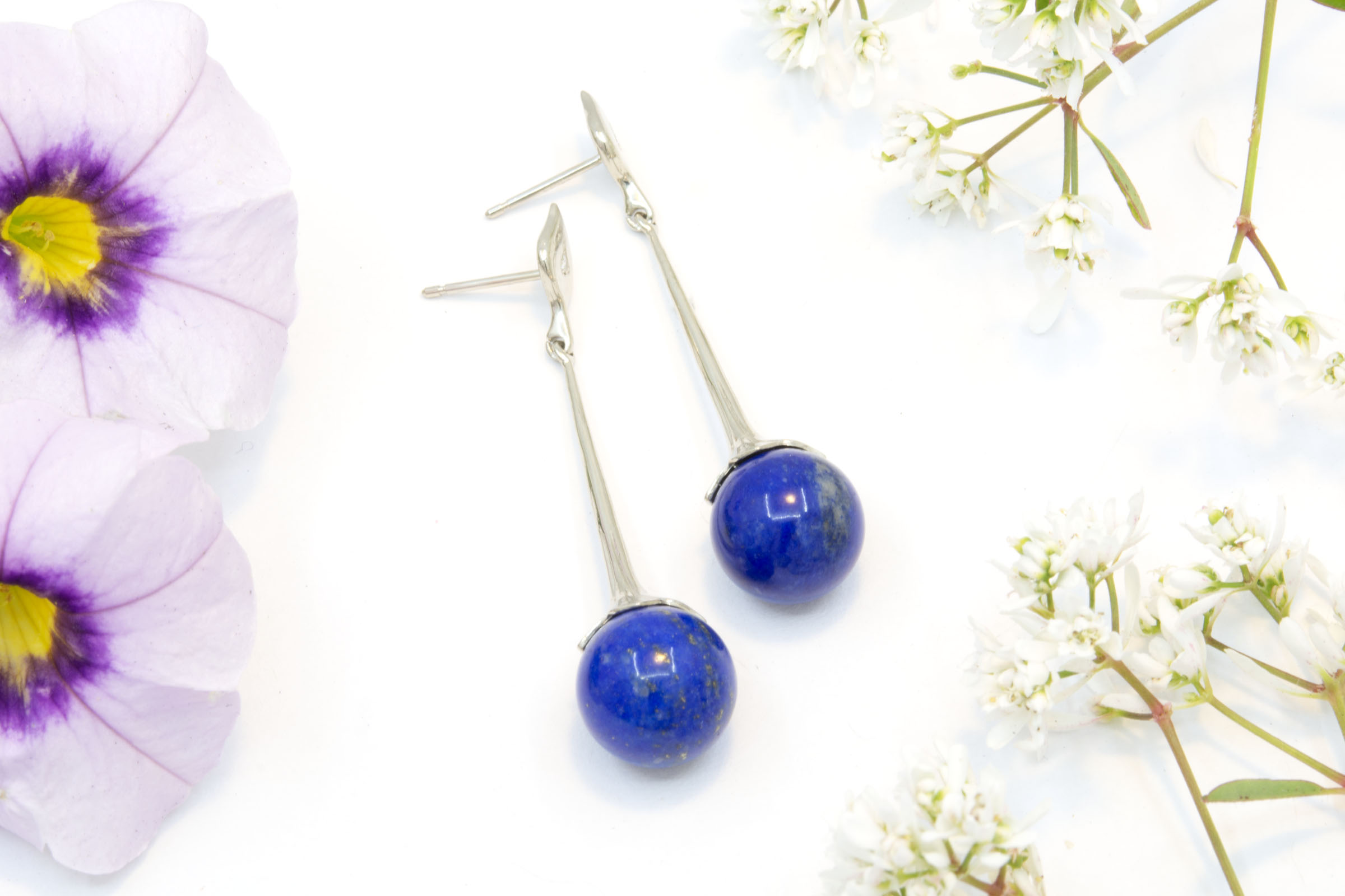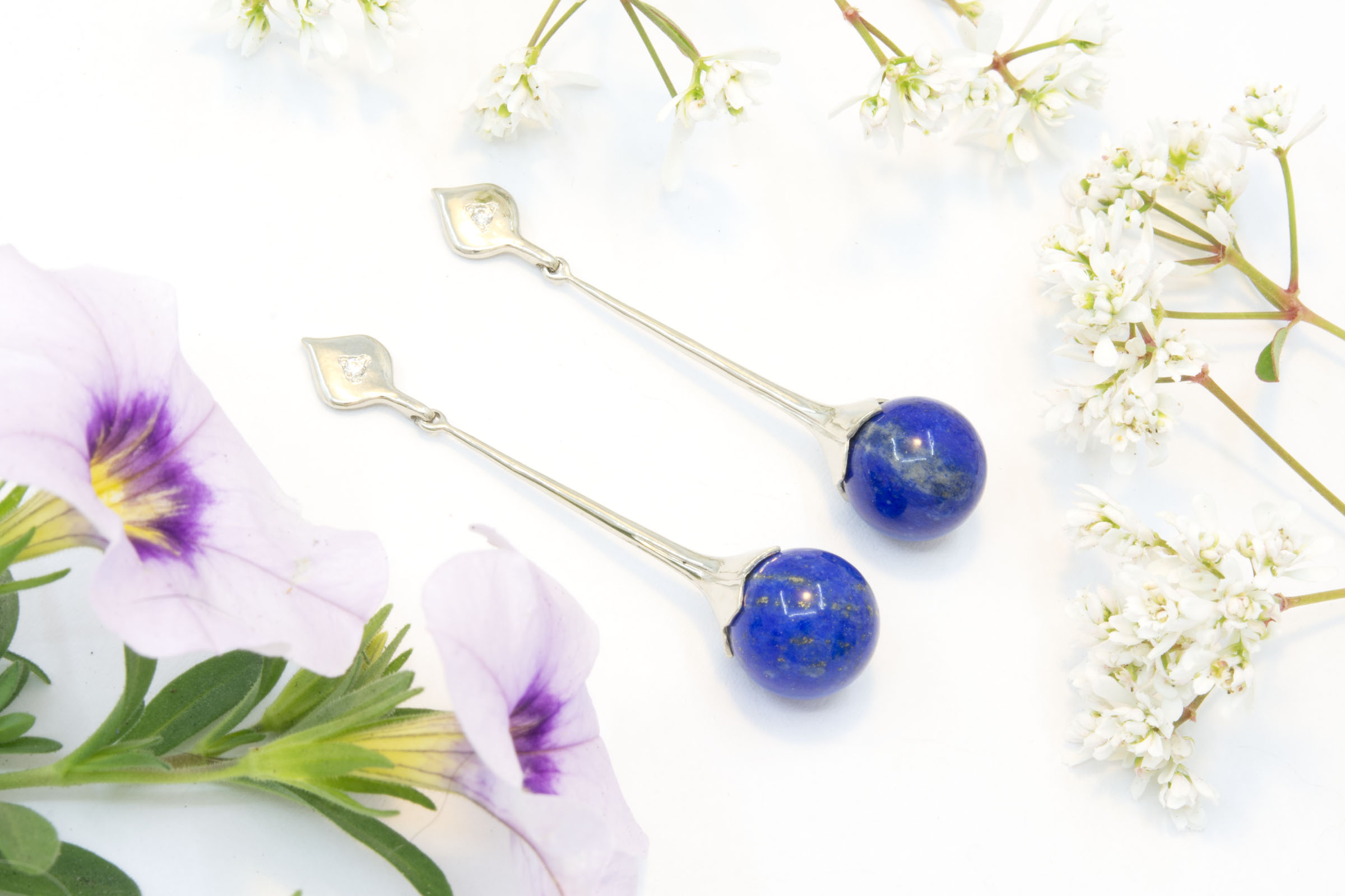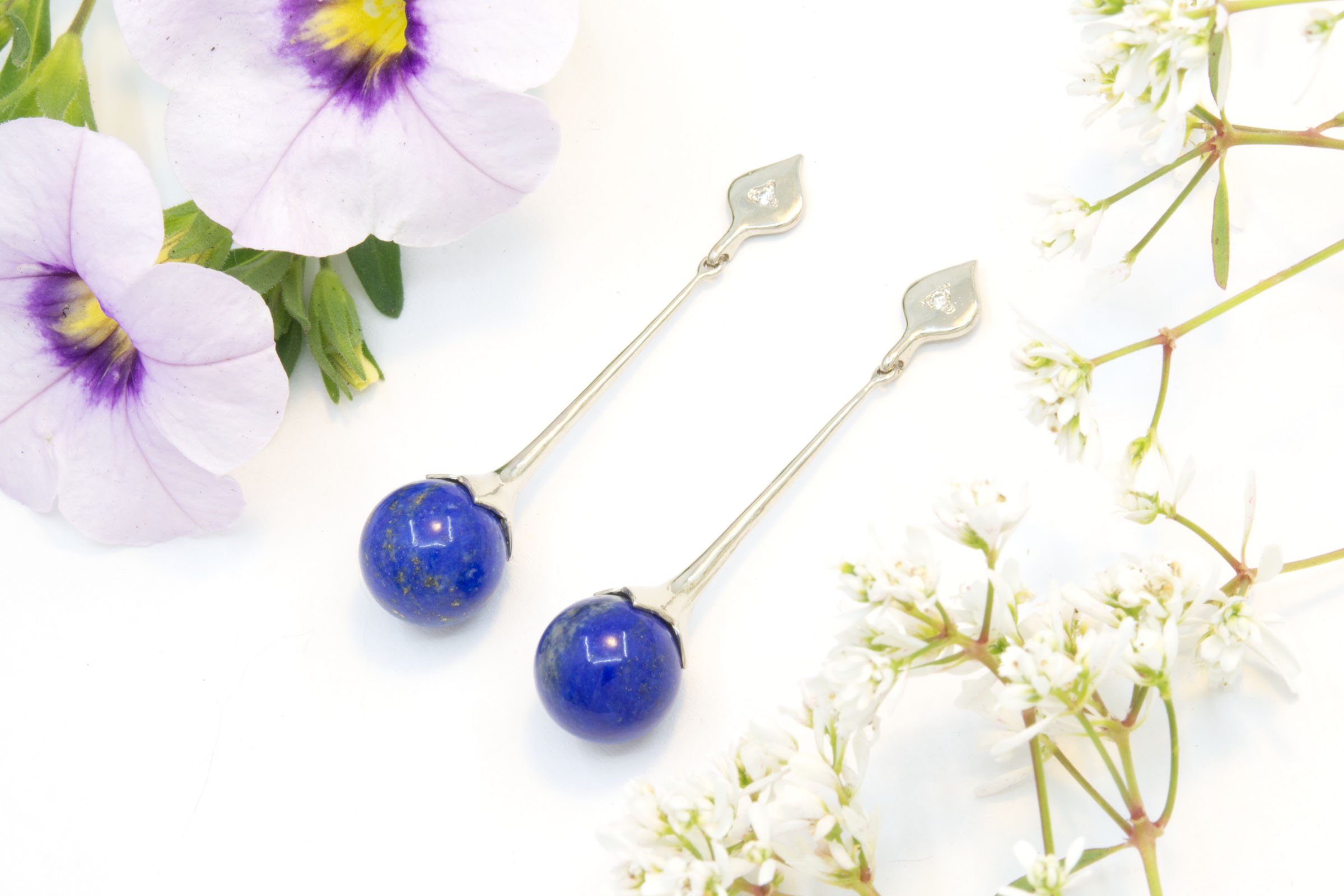 These 10mm lapis earrings feature a long turned design in 18k white gold with 0.03 cts t.w. diamond accents. These earrings measure about 1 3/4″ (45mm) long. Designed and handcrafted by Hunt Country Jewelers.