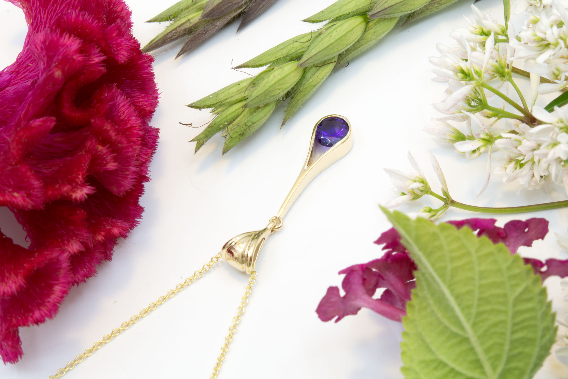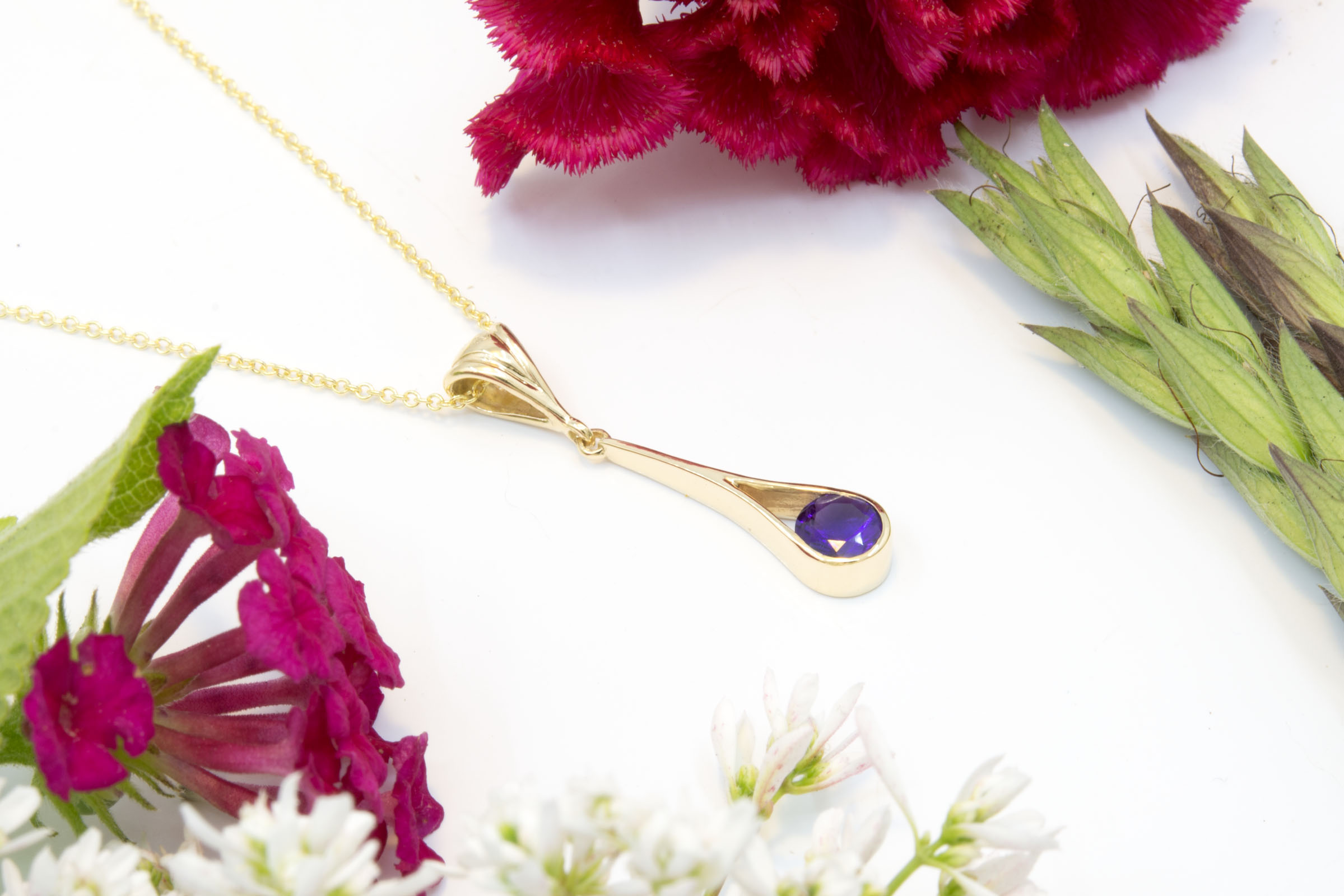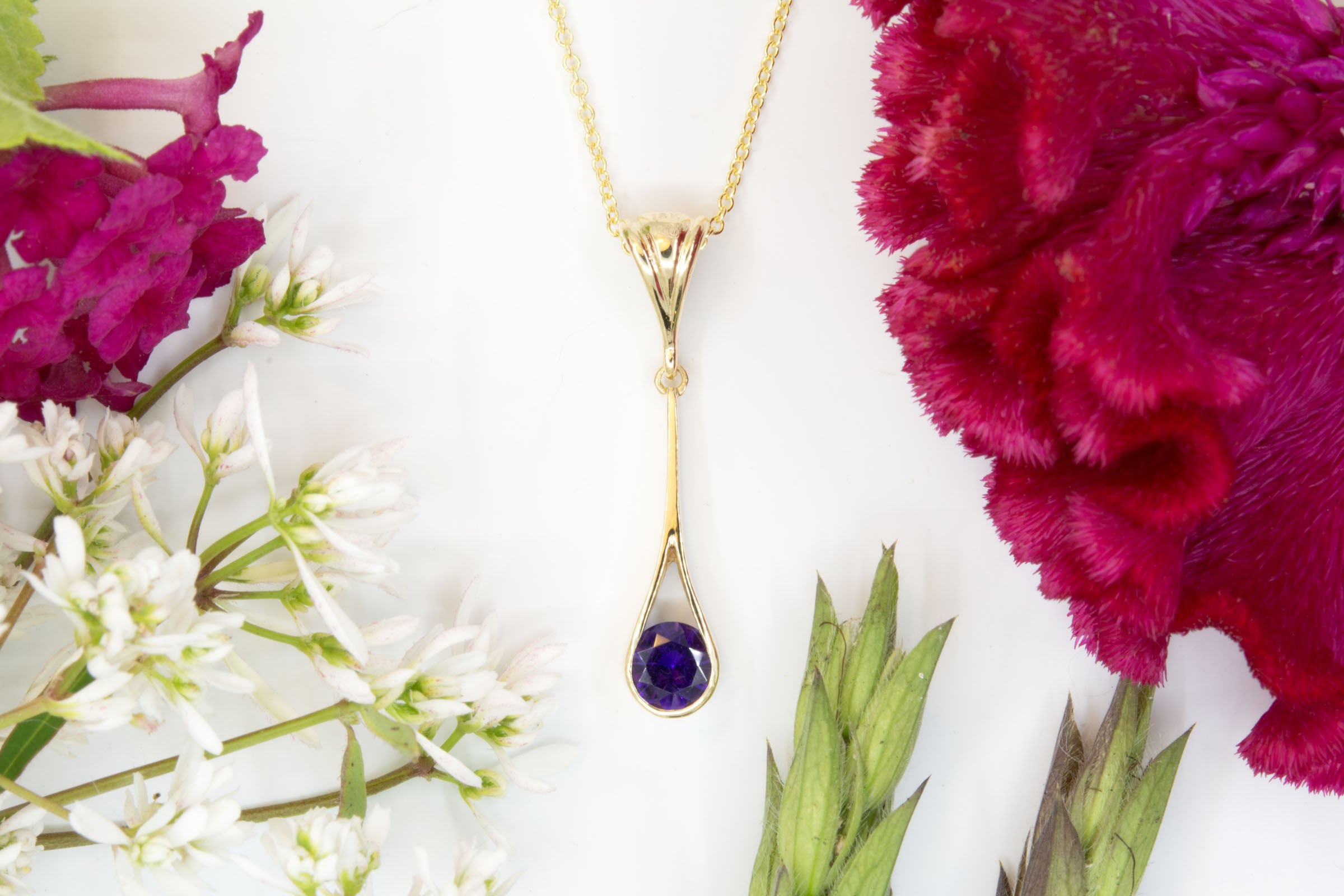 This 18k gold pendant features a 5mm amethyst in our single loop design. Designed and handcrafted by Hunt Country Jewelers. This pendant measures 1 3/4″ long and 1/4″ wide.