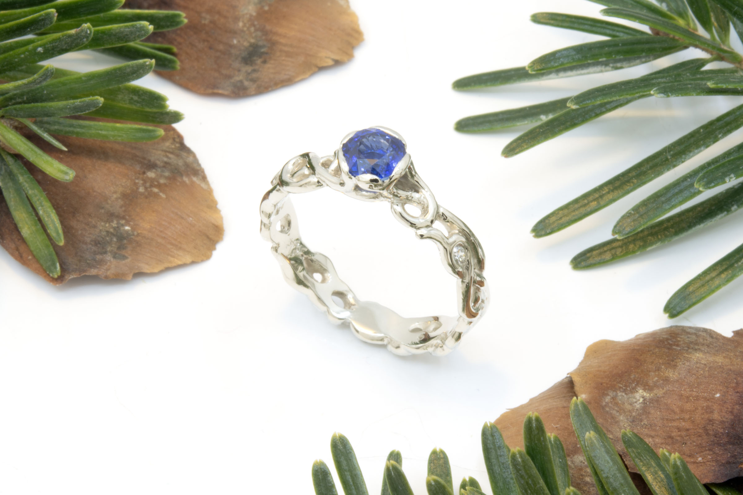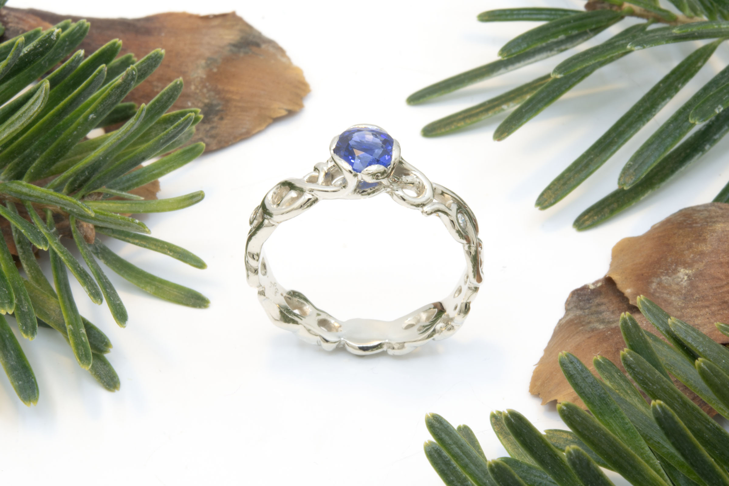 This 18k white gold ring features a 0.72 carat sapphire in an open filigree design with 0.03 carats total weight diamonds. Designed and handcrafted by Hunt Country Jewelers. This ring is a size 7 and can be resized within 2 sizes on request, for other sizes contact us about making a customized version that fits your needs.