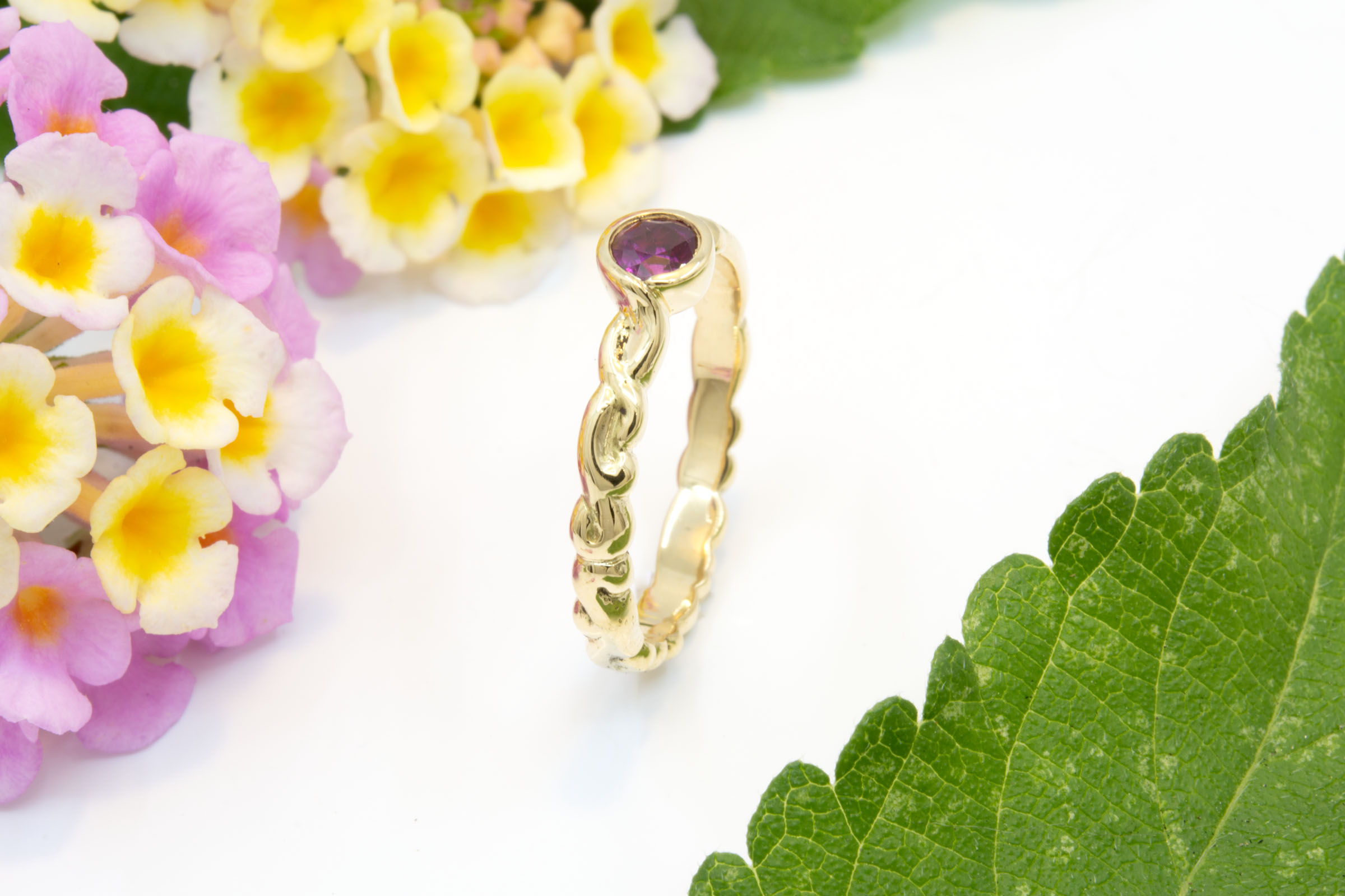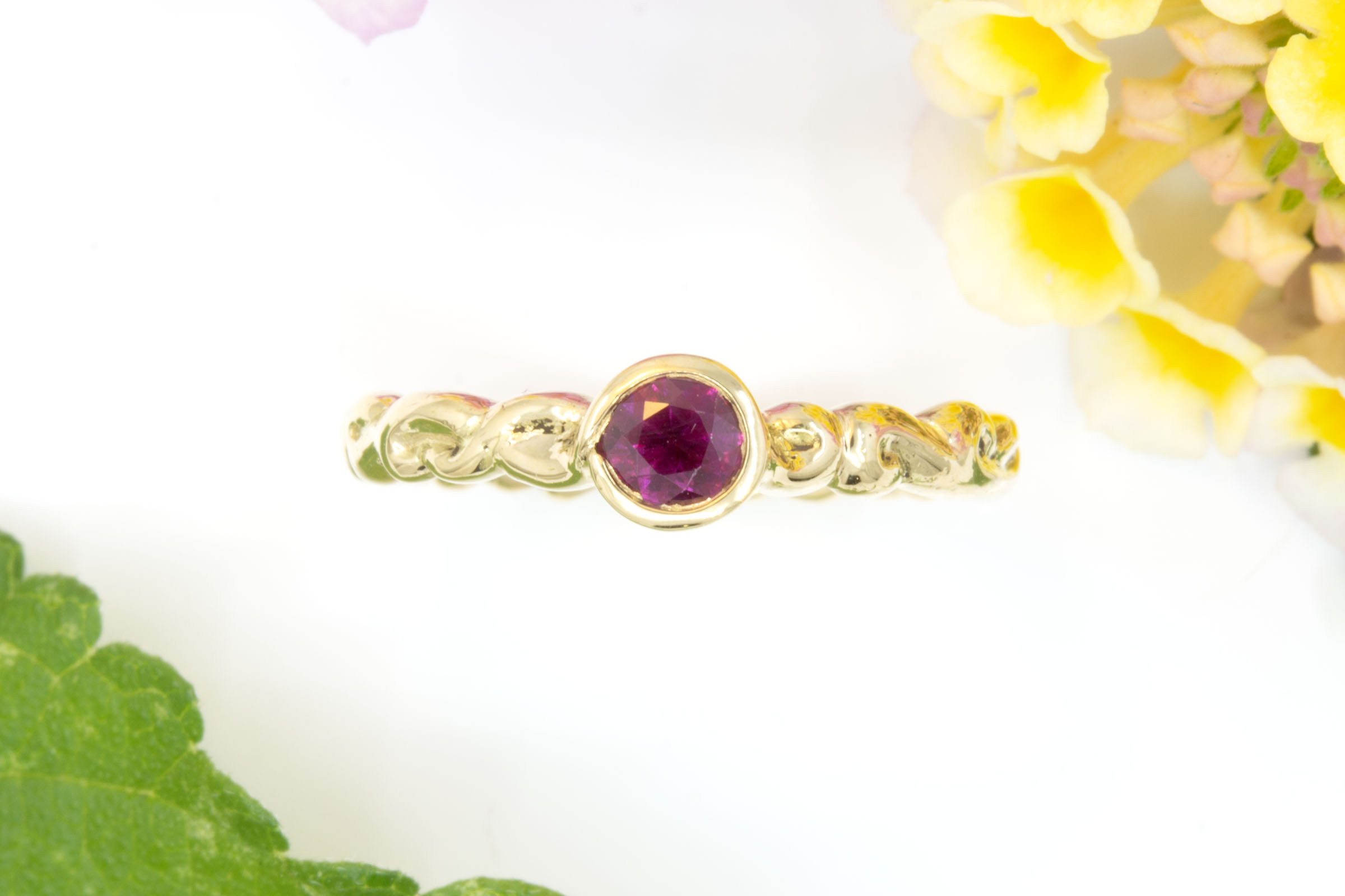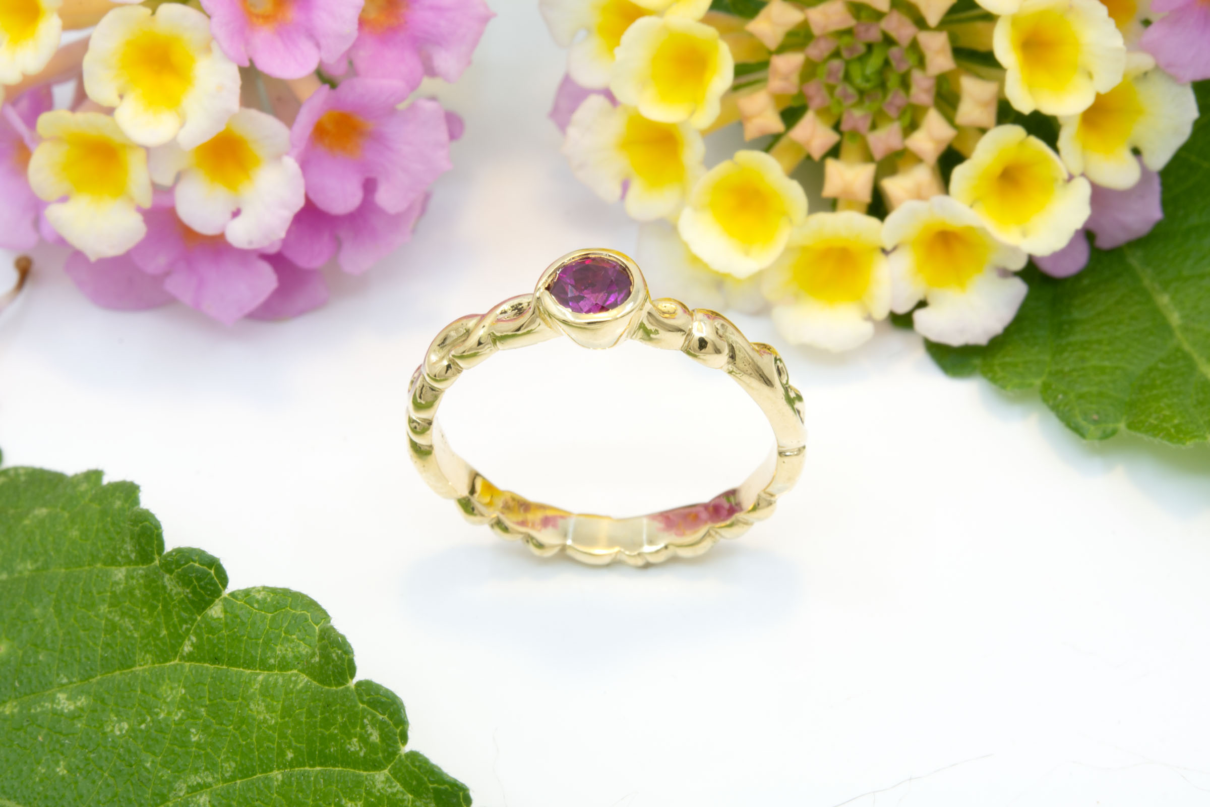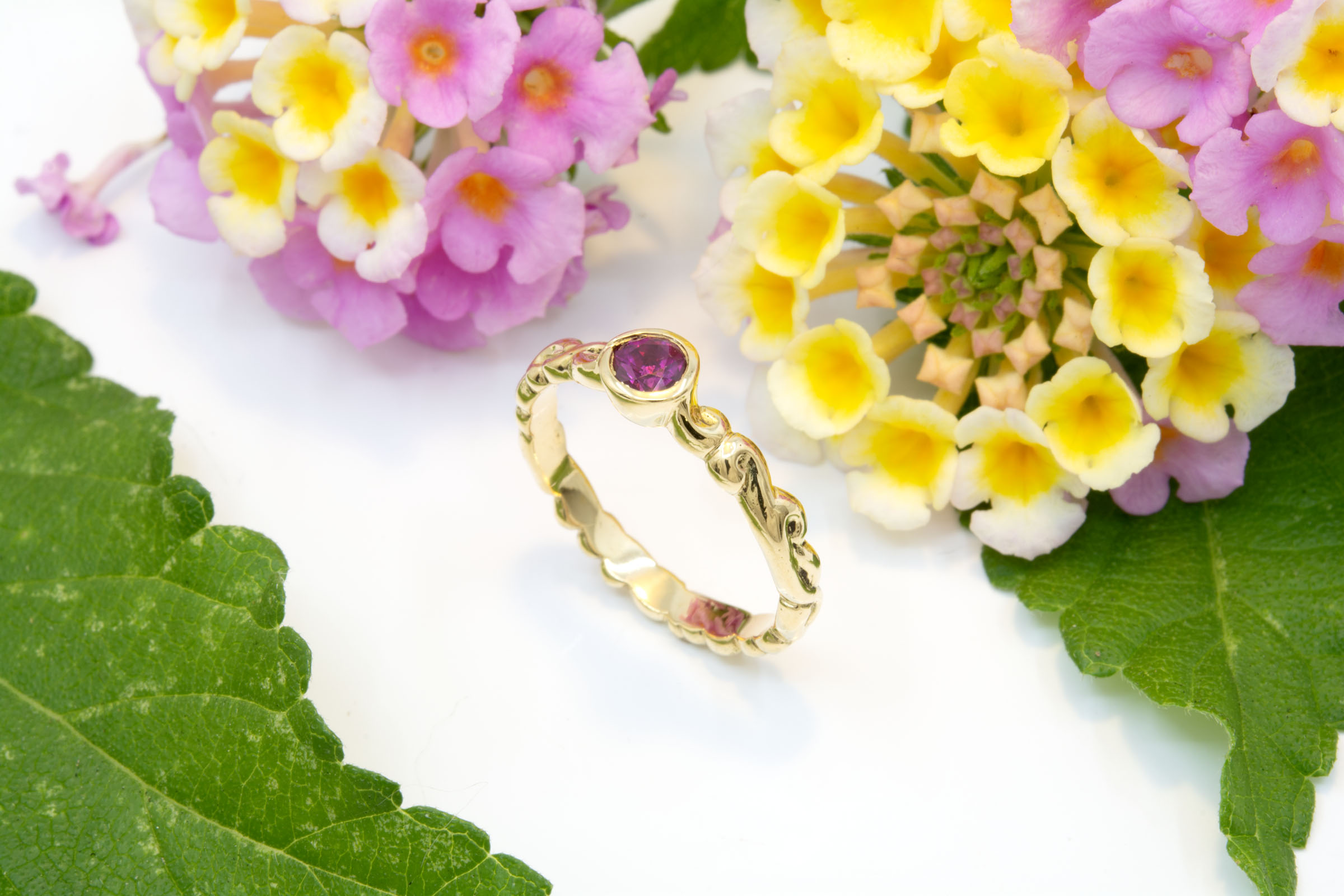 This 18k gold ring features a 0.35 carat ruby in a filigree design. Designed and handcrafted by Hunt Country Jewelers. This ring is a size 6 and can be resized within 2 sizes on request, for other sizes contact us about making a customized version that fits your needs.